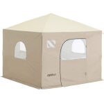 ●幕体:ポリエステル150D(屋根・側面幕一体型)遮光・側面部防炎加工 ●ポール:アルミ合金 ●付属品:張り綱、ペグ、収納袋、出入口カーテン |