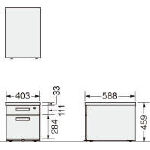 ●天板張材:布張り(再生ポリエステル) ●W403×D588×H459mm●天板クッション:ウレタンフォーム ●本体:スチール・メラミン焼付塗装(ホワイト)・ストッパー付低床自在キャスター仕様 ●引出し:ラッチ機能付・オールロック錠・下段引出しは転倒防止機構 ●引出し内寸法:上段/W317×D430×H98mm・下段/W317×D540×H265mm |