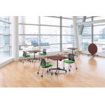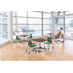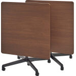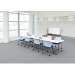 天板を中央で折りたためるセンターフラップ機構により、省スペース化と景観の美しさを両立。脚間が広く、大人数でも快適に打ち合わせができる、ミーティング用テーブルです。 |