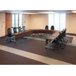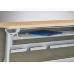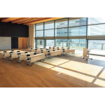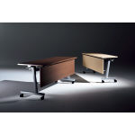 フォーマルで格調高い会議空間を演出するフラップテーブル「バリスタ」。脚部にはアルミを採用。重厚かつ直線的なデザインを表現しました。折りたたんで移動できるため、急なレイアウト変更にも対応可能。またケーブル処理へのさりげない配慮がポイントで、セミナールームなどにも適しています。 |