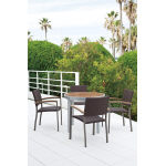 天然木のような風合いをもつ耐久性に優れた素材を使用。テーブル中央にはガーデンアンブレラを設置することができます。 |