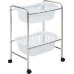 ●本体フレーム:クロームメッキ ●直径40mm双輪キャスター ●プラスチックカゴ2個付 |