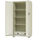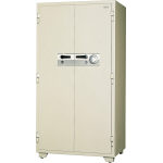 ●扉:両開き ●錠:快速ダイヤル錠+電子ロック錠 ●内容量:558リットル ●棚板・引出し:可動棚板(30mmピッチ)3枚、カギ付引出し2個 ●リロッキング装置付 ●高炉セメント使用 ●一般紙用2時間耐火性能試験合格 |