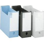 再生ポリスチレン樹脂を使用した丈夫なインジェクション成型品。背紙差替式で長く使える、ロングライフのボックスファイルです。 |