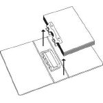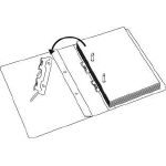 ウラ側の押え板(パイプ付)を書類ごと起こして、つづりひもをパイプから貫通させ書類を左側に移し、押え板(パイプ付)を書類・つづりひもから抜き取ります。
