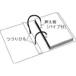 表紙のオモテ側の2つの穴からつづりひもを通し、図のように押え板(パイプ付)のパイプに通します。