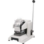 ●手動式打抜機 ●最大穿孔能力:PPC用紙15枚(厚さ1.2mmまで) ●針径:φ1.0mm ●穿孔奥行:文字中心から最大40mm ●1文字の構成は針4本X6本(24本)です。 ●レバー式・番号8桁・日付6桁共通 |