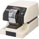 ●電動式打抜機・普及型 ●最大穿孔能力:PPC用紙25枚(厚さ2mmまで) ●針径:φ1.0mm ●穿孔奥行:文字中心から最大40mm ●電源:AC100V・50/60HZ ●消費電力200W ●1文字の構成は針4本X6本(24本)です ●ストロークスピード140回程度/分 ●レバー式・番号8桁・日付6桁共通 |