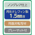 ●再生オレフィン樹脂製・1.5mm厚 ●ノングレア仕上 ●グレーマット(フェルト製)付 ●コピー・写真が付着しにくい両面非転写タイプのマットです。 ●すべりにくく、軽量で耐溶剤性・低温柔軟性にも優れた素材です。 ●照明等の光の反射が抑えられる目にやさしい仕上がりのノングレアタイプです。 ●再生オレフィン樹脂を使用していますので、焼却時に有害な塩化水素ガスは発生しません。 ※規格サイズ以外の別注品も承ります。 ※高温、直射日光の当たる場所に、長時間放置しないでください。熱い飲料の入ったコップなどは置かないでください。跡が付いたり、反ったりする場合があります。 |