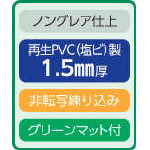 ●軟質再生塩化ビニール製・1.5mm厚 ●ノングレア仕上 ●2mm厚グリーンマット(発泡ポリエチレン製)付 ●コピー・写真が付着しにくい非転写加工された再生塩ビ製によるデスクマットです。 ●光学式マウスの使用に適した加工を施してあります。 ※規格サイズ以外の別注品も承ります。 (注意)一部反応しにくい光学式マウスもありますのでご注意ください。材質の特性上、温度・湿度によりサイズが若干収縮する場合があります。 |