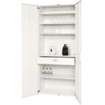 ●本体:スチール・粉体塗装 ●引出し:ステンレス製簡易天板付 ●カギ付 ●ラッチ付(両開扉部) ●180度開口扉 ●棚板4枚付 |