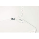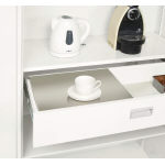 本体内部に小物を収納できる引出しを装備。引出し上部には、ステンレス製簡易天板(標準付属)を載せて、カップなどの仮置きができます。左右にスライドできる便利な仕様です。また、底板・引出し付棚板の右奥側に配線用コードホールを設けています。 |