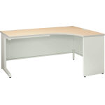 ●天板:木製・メラミン化粧板・ポリウレタン塗装仕上・29mm厚・コードホール付(3ヵ所) ●中央引出し:ラッチ機能付 ●本体:スチール・粉体塗装(ホワイト) ●脚ベース:ABS樹脂カバー・アジャスター付 ●幕板取付高:床上140mm |