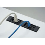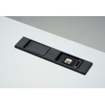 防塵用の開閉カバー装備の配線ユニット。開閉カバーは、それぞれ独立して両サイドから落とし込み収納できます。電源コンセントとLANコネクタが標準で取り付けられています。