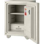 ●錠:ダイヤル+シリンダー錠 ●内容量:51.5リットル ●棚板・引出し:棚板1枚、カギ付引出し1個 ●自動ロッド装置付 ●A4ファイル縦置収納可 ●一般紙用1時間耐火性能試験合格 |