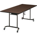 天板を折りたたんで省スペース収納。ロックレバーを手前に引き、天板を折りたたみます。完全に折りたたむと固定金具が働き、省スペース収納が可能になります。テーブルをセットする時は固定金具を解除し、左右に開くだけです。折りたたんで収納すると10台が約2mに納まります。