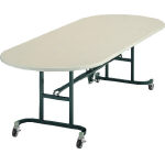 天板を折りたたんで省スペース収納。ロックレバーを手前に引き、天板を折りたたみます。完全に折りたたむと固定金具が働き、省スペース収納が可能になります。テーブルをセットする時は固定金具を解除し、左右に開くだけです。折りたたんで収納すると10台が約2mに納まります。