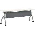 ●天板:木製・メラミン化粧板・ABS樹脂エッジ・25mm厚 ●脚部:スチール長円/丸パイプ・メラミン焼付塗装(シルバー)・φ53mmナイロン双輪キャスター4個(2個ストッパー付) ●折りたたみ機構:天板跳ね上げ式 ●幕板:PVC樹脂 |