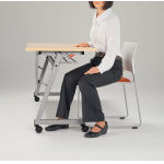 天板の折りたたみ操作と連動して幕板が下り、棚とともに収納されます。使用時は下肢空間が確保でき、収納時は奥行きを抑えて省スペース収納できます。