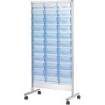 ●垂直型(3列10段) ●フレーム:アルミ・アルマイト仕上 ●ケース:PS樹脂(A4判)・クリアブルー色 ●φ50mm双輪キャスター(全ストッパー付) |