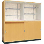 ●本体:木製・ポリエステル化粧板(オーク柄) ●ガラス引戸:5mm厚(透明) ●棚板(5mm厚・透明)4枚付 ●引戸:木製・ポリエステル化粧板・棚板2枚付 ●背板:有孔ボード ●台輪:木製・ポリエステル化粧板 |