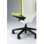 座の傾斜スライドと連動しながら背が後傾するスライド3WAYシンクロロッキング機構により、座前部の持ち上がりがなく、骨盤と大腿部の角度を最良に保つことができます(背最大傾斜角20°)。背のラインにフィットする、ランバーサポート形状の背もたれが、腰椎を支え腰への負担を軽減します。