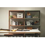 【収納例】奥行き600mmの棚板には試作品や大きめのサンプル帳などの収納が可能です。また2段目・4段目の棚板は収納物に合わせて高さ調節ができます。(棚板ピッチ:50mm)