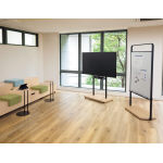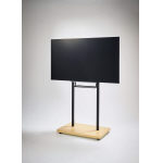 ディスプレイと棚板の高さを独立して調節可能なディスプレイカート。木目調のベースはキャスター付で、簡単に移動が可能です。配線を収納することですっきりと収まります。 |