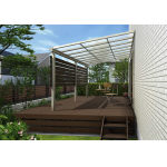 ソラリア テラス屋根 リウッドデッキ 納まり/600N/[m2](積雪〜20cm地域用) 柱標準タイプ・フラット型/関東間/呼称幅2間×呼称奥行9尺/プラチナステン/屋根ふき材:ポリカーボネート板・トーメイマット/目隠しパネル 1階用(2間×9尺)・横板格子(124mm×25mm)×7本・すき間25mm・ショコラウォールナット(オプション)/リウッドデッキ S 呼称幅2.5間×呼称奥行12尺/Sタイプ/レッドブラウン/リウッドステップ5型Sタイプ(2段)(オプション)/床下囲い(オプション) |