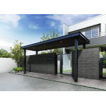 20-54 独立柱納まり/屋根(モダンエッジ枠):カームブラック色/軒天(外観側ダウンライト(センサー)加工付き):スモークエルム色/独立柱(角柱):カームブラック色/角樋:カームブラック色〔ポケットキーシステム〕電気錠付 ルシアス 門扉FP1型 04・10-16R:カームブラック色/エクステリアポストG3型:カームブラック色(インターホンカバーユニットB規格型:ブラック色) |