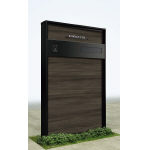 正面パネル・笠木・幅木 B7:カームブラック、本体パネル YD:スモークエルム、27ステンレスモダン表札YESK4・インターホン加工付き・ポスト加工付き(エクステリアポストG3型) |