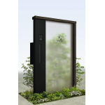 機能柱・正面パネル・幅木 B7:カームブラック 笠木・146見込柱 YD:スモークエルム、本体パネル アクリルパネル、ステンレスカラー表札・インターホン加工付き・ポスト加工付き(エクステリアポストT9R型)・演出照明Sタイプ |
