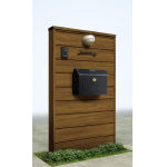 本体パネル・笠木・幅木 PR:ドライチーク、照明18型、エクステリアポスト T5型 B7:カームブラック、ステンレスアイアン表札・インターホン付き |