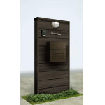 本体パネル・笠木・幅木 YD:スモークエルム、照明18型、エクステリアポスト T12型 6D:シュペリグレイ、ステンレスアイアン表札・インターホン付き |