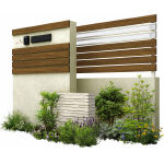 カスタマイズパーツ:化粧材(90×20)/フェンス横格子(90×20:ポリカーボネート板:トーメイマット色・H2)、エクステリアポストG3型、表札(エクスタイル:メタルサイン) |