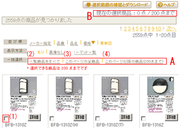 「このページ以降の商品(200点まで)」(4)をクリックすると、選択可能な最大点数になるまで、表示中のページ以降の商品を一度に選択することができます。