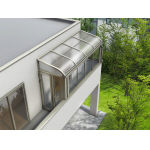 ソラリア バルコニー囲い 躯体式 特殊納まり(分割囲い) TypeI 600N/[m2](積雪20cm相当)・アール型 関東間 間口2間×奥行4.5尺 正面・右側面:高窓・左側面:ドア+FIX窓 プラチナステン色 屋根ふき材:熱線遮断ポリカーボネート板・クリアマット色 |